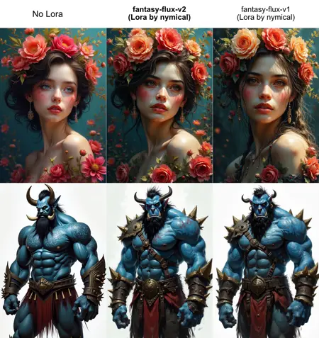 (All the images provided are generated with fp8 version of t5xxl, the fp16 version doesn't follow prompt very well (even without any lora), so I don't know what's going on with that. If you're generating locally, try the fp8 version of t5xxl if flux ignores your specific hair or skin color instructions.)