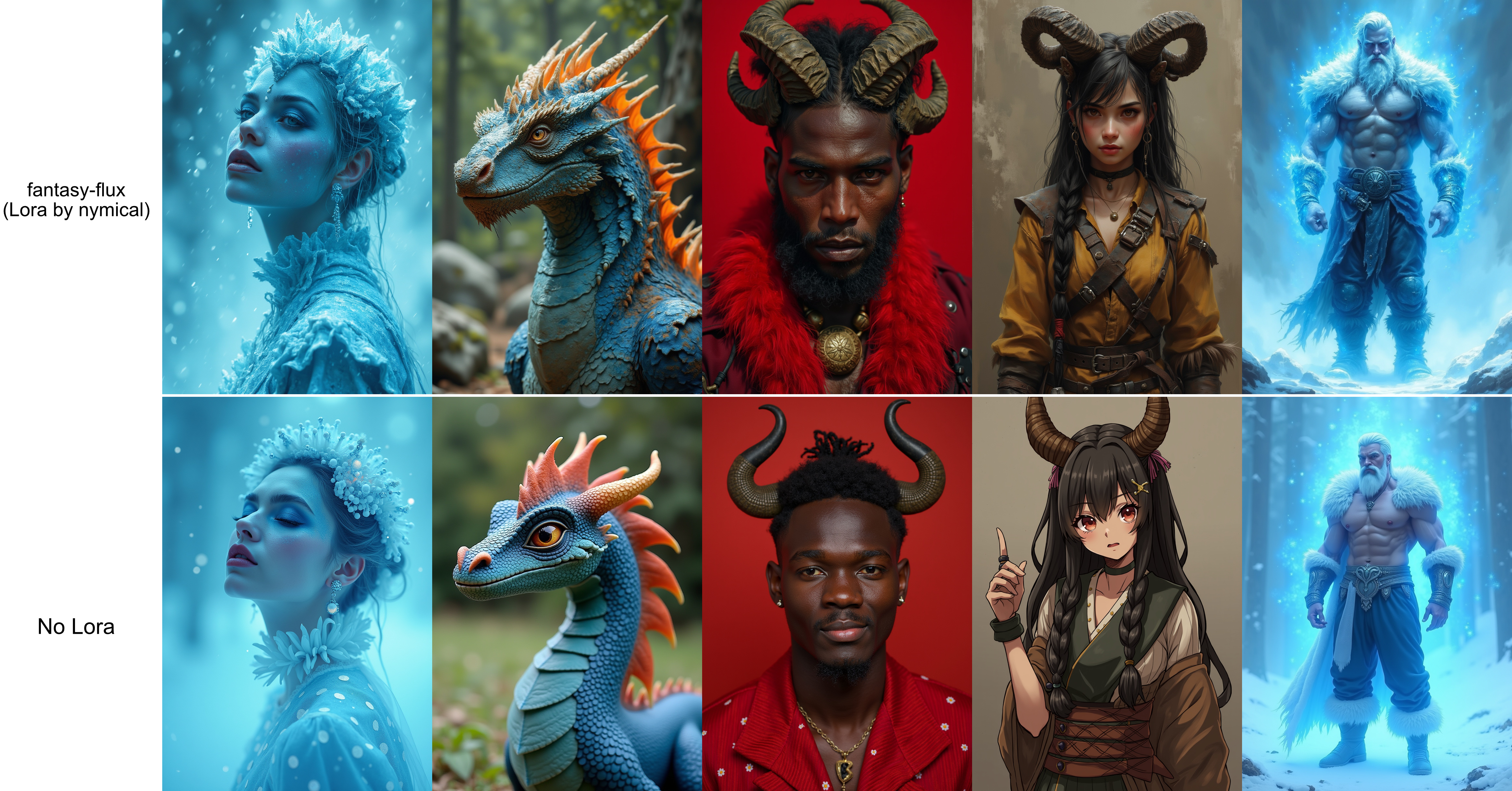 (All the images provided are generated with fp8 version of t5xxl, the fp16 version doesn't follow prompt very well (even without any lora), so I don't know what's going on with that. If you're generating locally, try the fp8 version of t5xxl if flux ignores your specific hair or skin color instructions.)