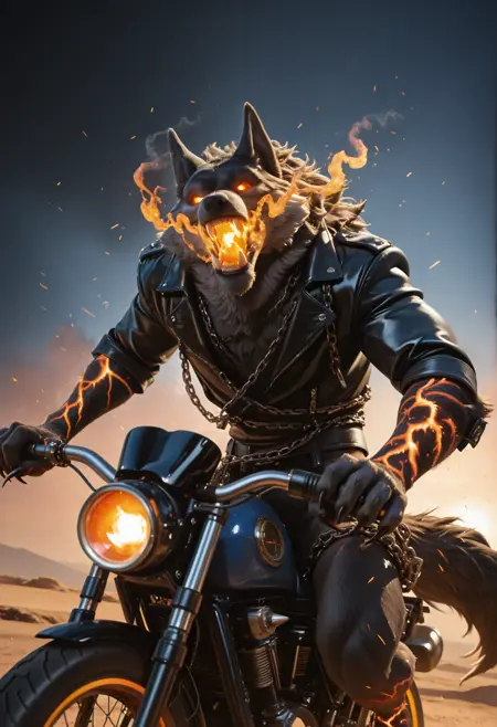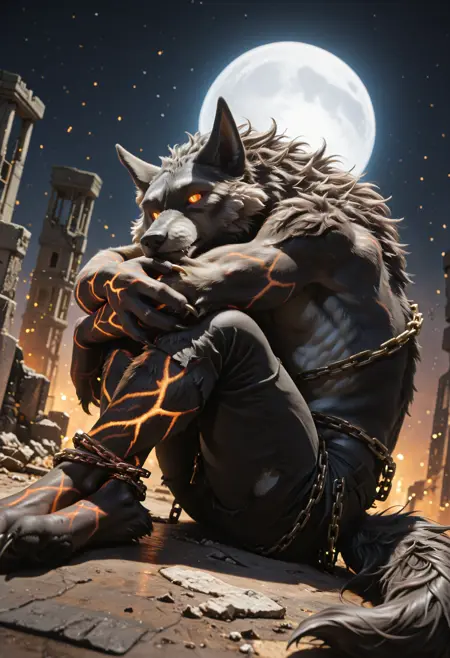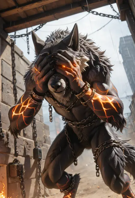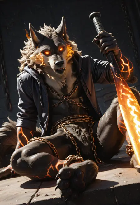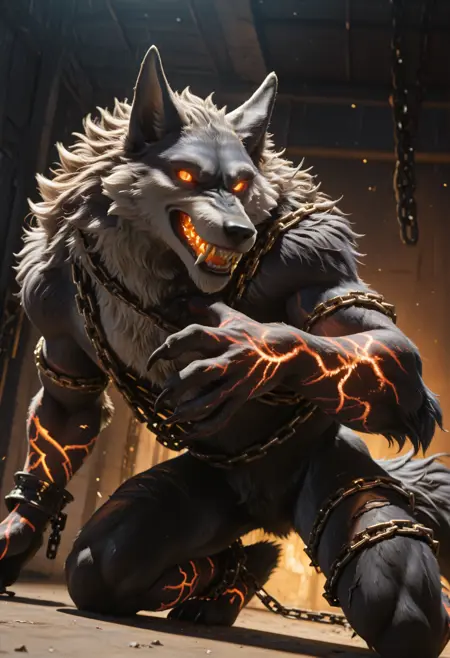 // 卓越:f3nrir_sm1te, wolf boy, hellhound, solo, chain, glowing, glowing eyes, glowing markings, male focus, 1boy, furry, furry male, tail, no humans, claws