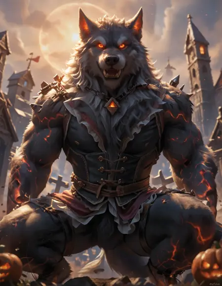 // Illustrious: f3nrir_sm1te, wolf boy, hellhound, solo, chain, glowing, glowing eyes, glowing markings, male focus, 1boy, furry, furry male, tail, no humans, claws