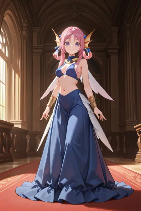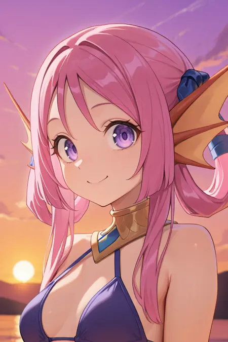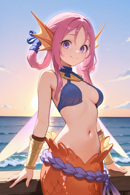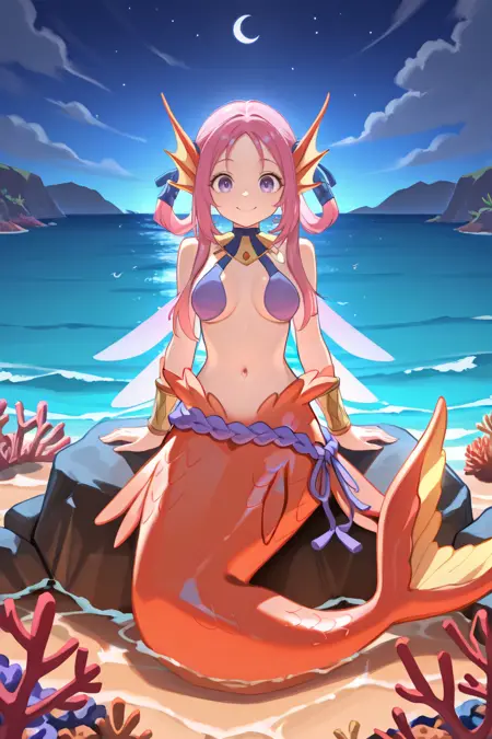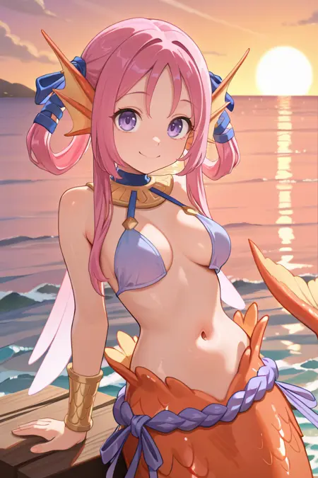 役立つタグ: 中程度の胸、1girl、髪の輪、ピンクの髪、長い髪、横髪、紫色の目、モンスター娘、人魚、膝なし人魚、ヒレ、頭のヒレ、人魚の尾、オレンジ色のウロコ、翼、ブレイサー、ジュエリー、へそ、ハーネスネック、ブリッジなしブラ、ビキニトップのみ、青いしめなわ、