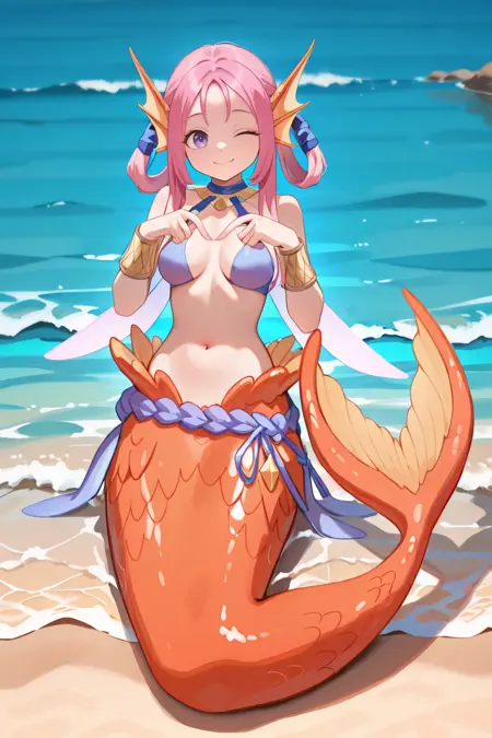 役立つタグ: 1girl、中程度の胸、髪の輪、ピンクの髪、長い髪、横髪、紫色の目、モンスター娘、人魚、ヒレ、頭のヒレ、人魚の尾、オレンジ色のウロコ、翼、ブレイサー、ジュエリー、へそ、ハーネスネック、ブリッジなしブラ、ビキニトップのみ、青いしめなわ、ウセクカラー