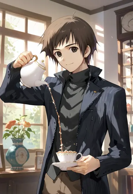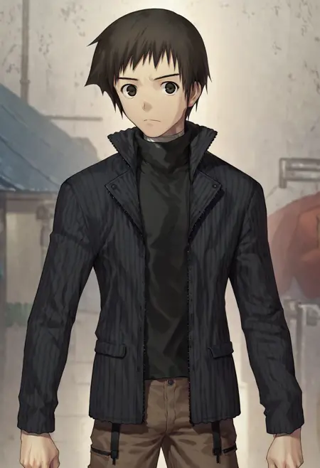 1boy soujuurou shizuki, black jacket black shirt turtleneck brown pants