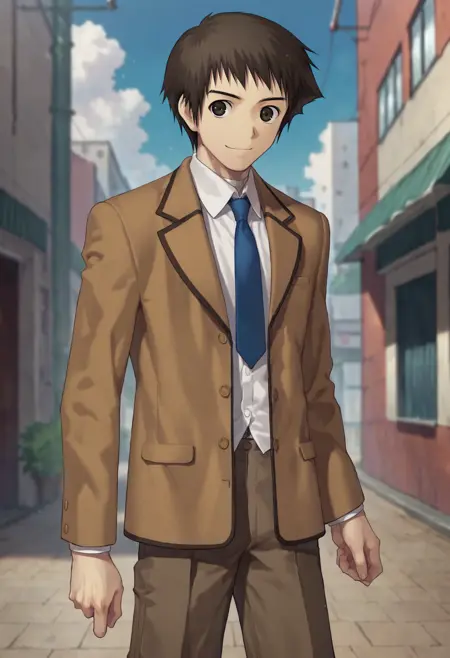 1boy soujuurou shizuki, brown jacket white shirt school uniform brown pants blue necktie
