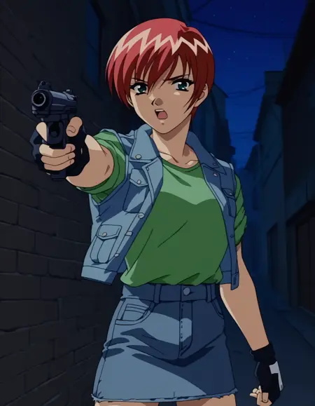 - asami, short hair, denim jacket, green shirt, t-shirt, denim skirt