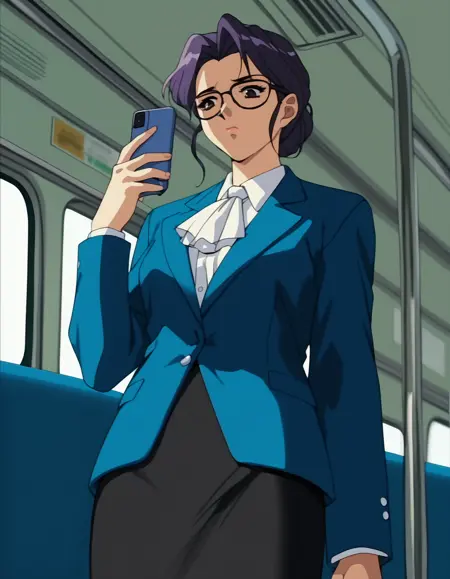 - ayka, glasses, blue jacket, white ascot, skirt suit, collared shirt, pencil skirt, black skirt, pantyhose