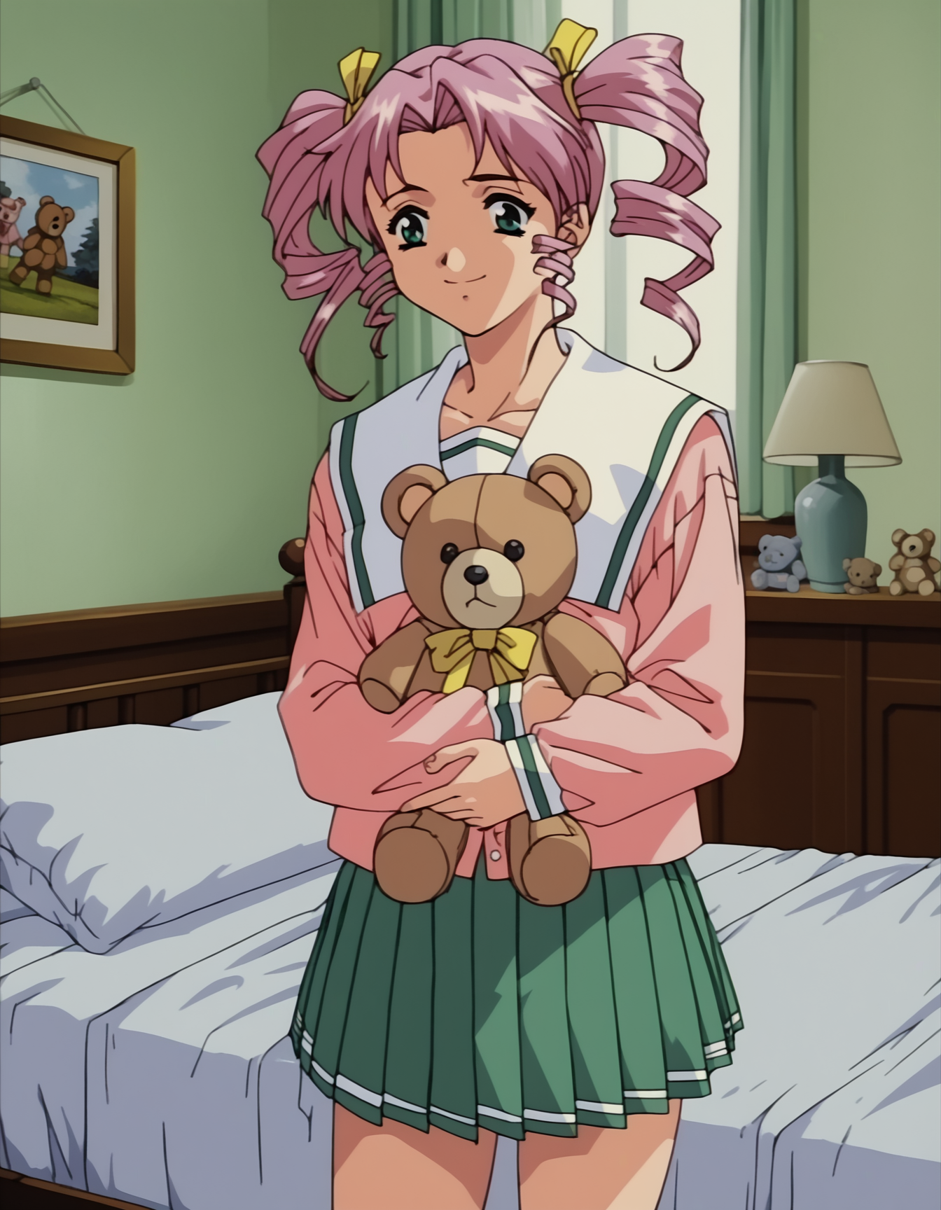 - serafuku, pink shirt, yellow bow, pleated skirt, green skirt