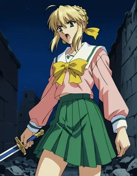 - serafuku, pink shirt, yellow bow, pleated skirt, green skirt