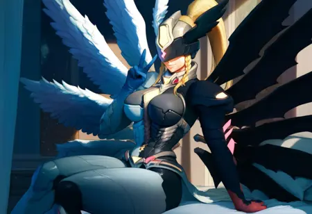 긍정적 프롬프트: 마스테몬, 가슴, 인체형, 흰 피부를 가진 여자, 천사 날개, 악마 날개, 갑옷, 헬멧, 금발, 땋은 머리, 꼬리머리, 하이힐