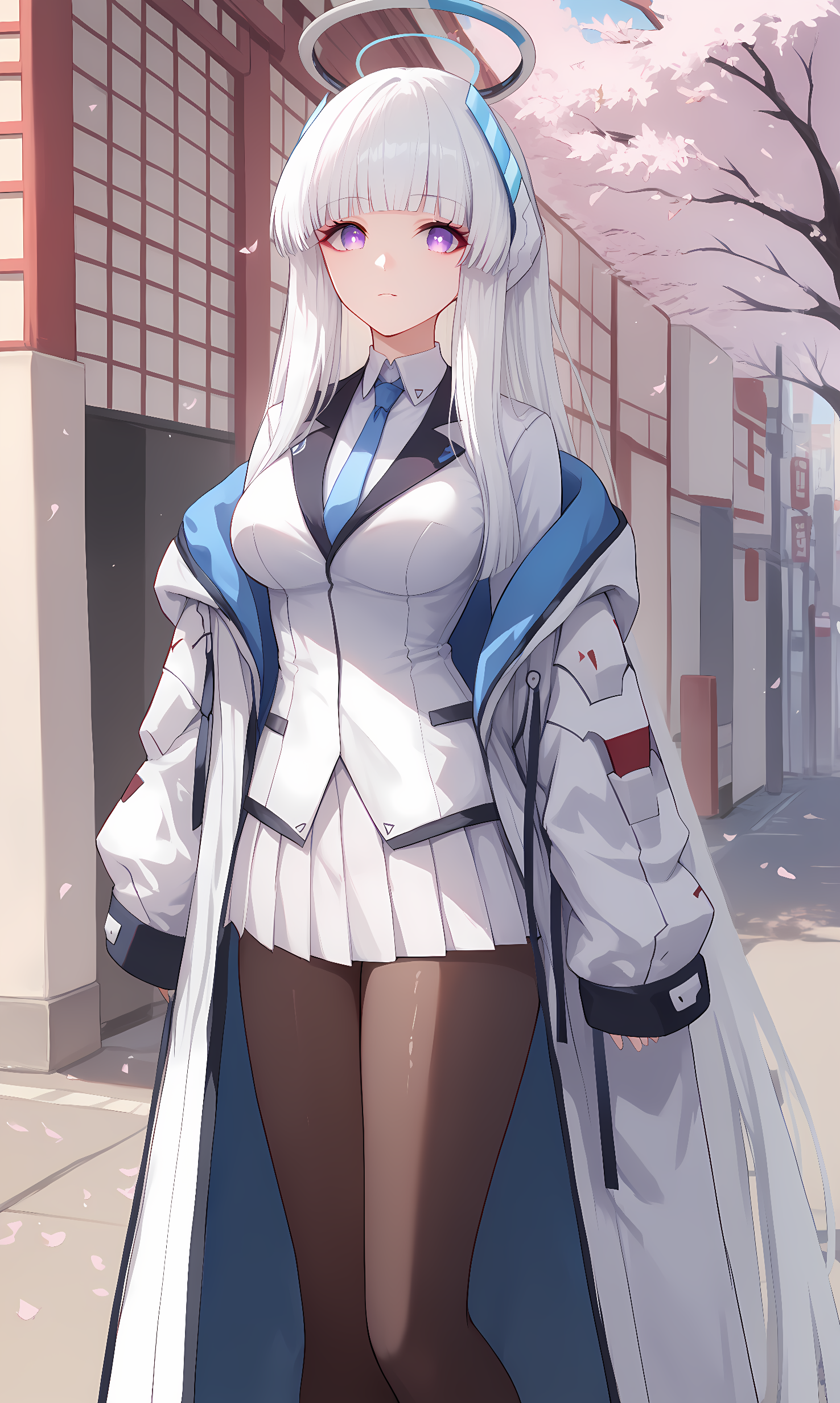 白いコート、片肩出しコート、開いたコート、長袖、白いジャケット、青いネクタイ、白いスカート、プリーツスカート、黒いパントイーズ、白い靴