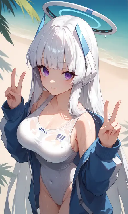ushio_noa、紫の目、白い髪、異常に長い髪、バッテン前髪、サイドロックス、髪飾り、ハロー