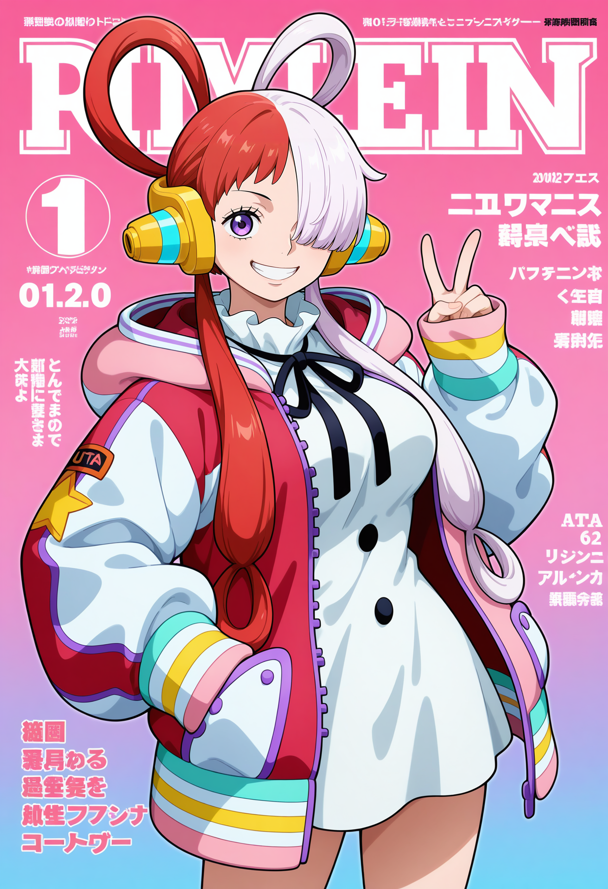 outfit2aauta, 긴 머리카락, 반나절 머리카락, 머리걸이, 이중꼬리, 헤드폰, 한쪽 눈 위로 누운 머리카락, 한쪽 눈 가린 상태, 보라색 눈, 가슴, 목 리본, 흰색 드레스, 후드 재킷, 다채로운 재킷, 벌린 재킷, 긴 소매, 손가락을 넘는 소매