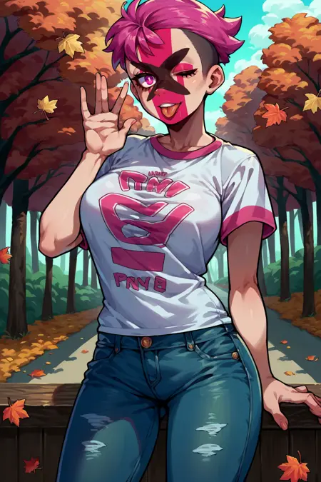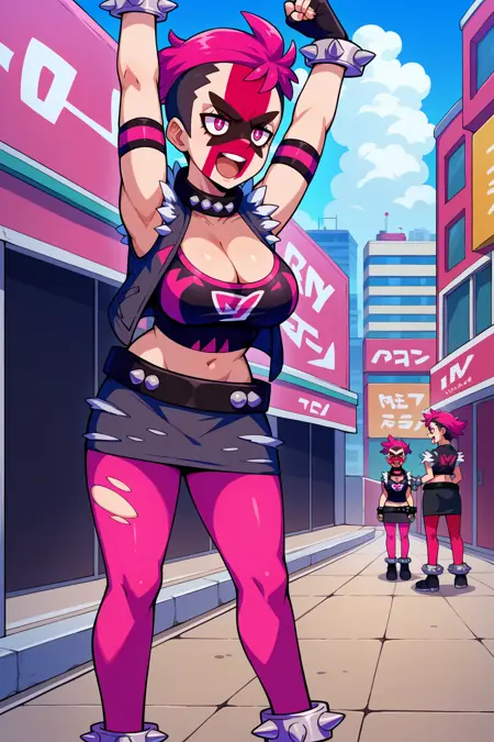 Add "facepaint, armband, collar, black vest, black crop top, cleavage, fingerless gloves, torn clothes, spiked bracelet, belt, black skirt, pink pantyhose, black boots" for her typical look.