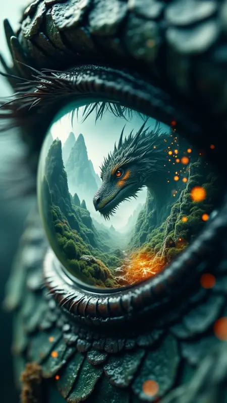 우주적 괴물: 용이나 불사조 같은 신화적 생물들이 천상적 풍경에서 솟아오르며, 그 형태가 먼 은하의 빛으로 뒤덮인 이미지를 만들어냅니다.