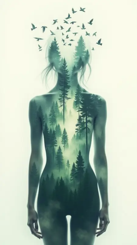 정신적인 풍경: 신화적인 인물과 자연의 아름다움이 매끄럽게 융합된 초현실적인 풍경을, 더블 노출 효과를 사용해 매혹적이고 꿈같은 시각적 이미지를 생성합니다.