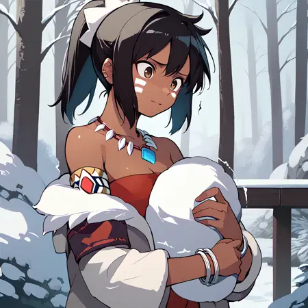 トリガーワードと外見: etrianshilleka、白い顔の模様、濃い肌、茶色い目、黒髪、ポニーテール