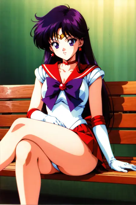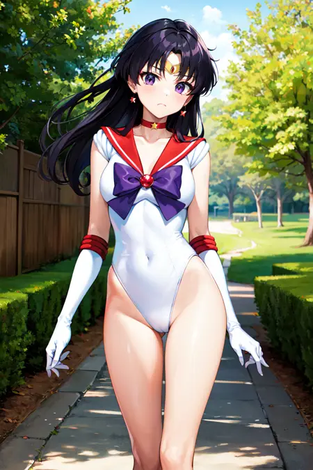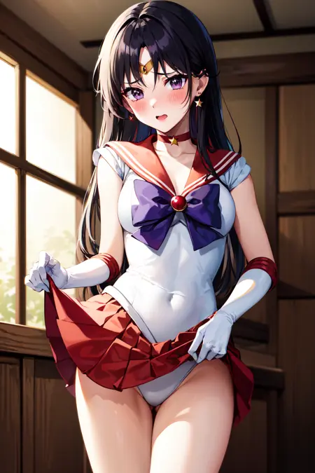 outfit1sama1, tiara, sailor senshi uniform, white gloves, red sailor collar, red skirt, star choker, elbow gloves, pleated skirt, bare legs, purple bow