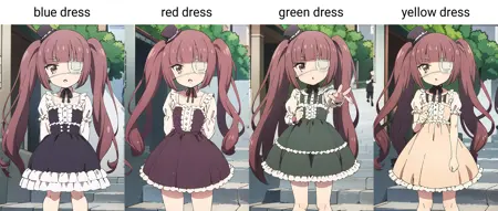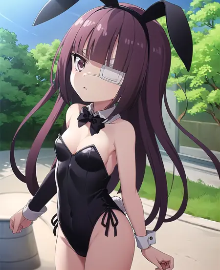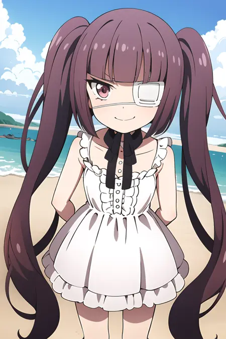Training images include her white dress and swimsuit. Can add umbrella. Try adding eyepatch to negatives.
