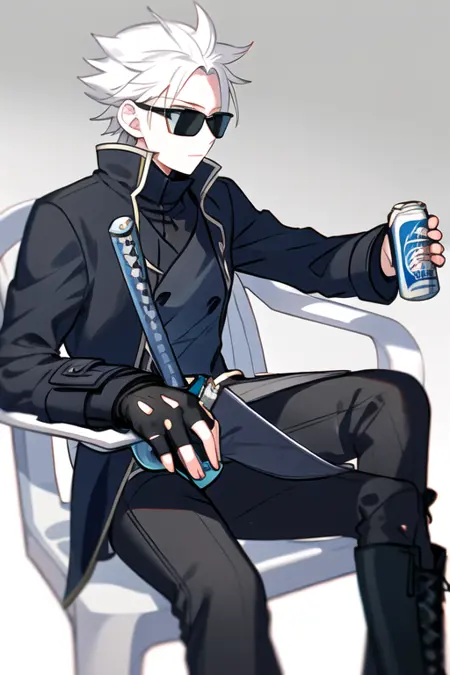 (((Actually if you want to summon vergil you need to write motivatedchair, plastic chair, solo, short hair, simple background, shirt, gloves, long sleeves, 1boy, white background, holding, sitting, closed mouth, jacket, full body, weapon, white hair, grey hair, male focus, boots, open clothes, black gloves, pants, sword, artist name, fingerless gloves, black footwear, holding weapon, vest, coat, black shirt, shadow, chair, holding sword, black pants, sunglasses, knee boots, katana, sheath, forehead, open coat, black coat, sheathed, can, blue vest, on chair, hair slicked back, blue coat, holding can, beer can, holding sheath)))