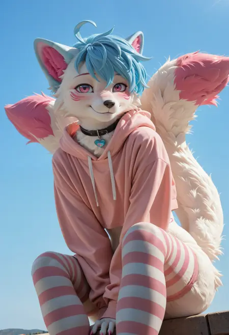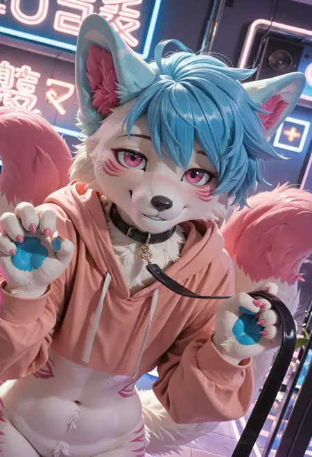 // Illustrious: ol1ver_pr1nce, arctic fox, animal ears, furry, blue hair, tails, fluffy fur, solo, male focus, pink claws, pink eyes, 1boy, looking at viewer, furry male, body fur, collar, striped stockings, pink cropped hoodie, clothed, clothes