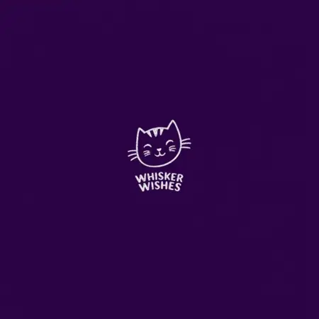 一个简洁可爱的标志,背景为带有轻微纹理的深紫色纯色。中央是一只用极简线条勾勒出的白色风格化猫脸,长而弯曲的胡须增添俏皮感,表情迷人而活泼。猫脸下方,“Whisker Wishes”品牌名称以白色细腻的小写手写体呈现,与深紫色背景形成完美对比。