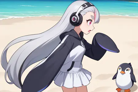 giapen, very long hair, grey hair, blue streaked hair, single hair intake, pink eyes, thick eyebrows, headphones, white skirt, zipper, sleeves past wrists, monochromatic sweatshirt, penguin costume, long sleeves