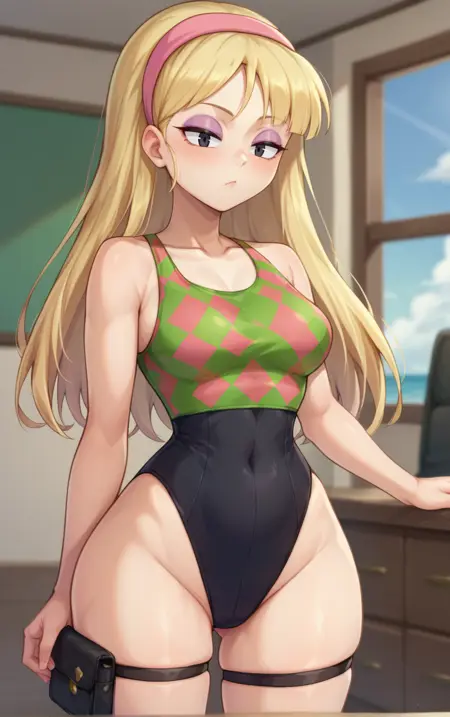 KendallPerkinsSDXL,1girl,wide hips,long hair,blonde hair,swimsuit,thick thighs,hairband,black eyes,leotard,thigh strap,eyeshadow,pink hairband