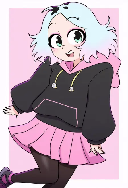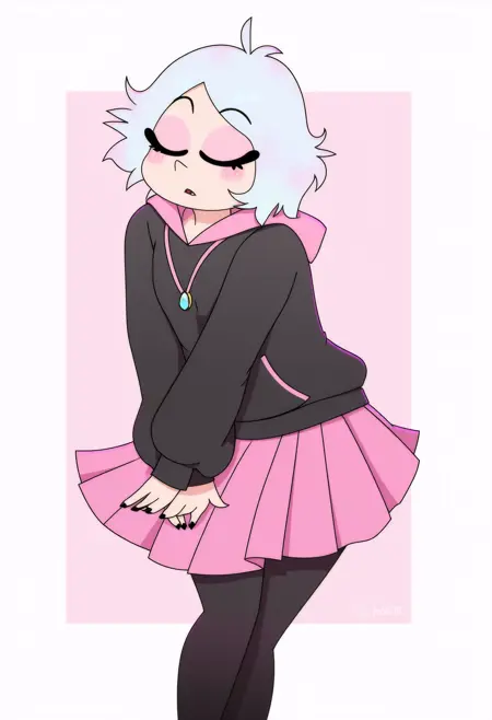 black hood, pink skirt, black eyeliner, white hair, black tights, black nails,