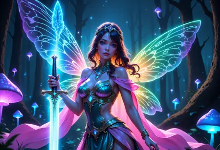 "cinematic shot of a adult female magical fairy, beautiful face details and long hair, holding a magical glowing sword in an epic attack pose, colorful magical fairy wings on her back, magical fantasy forest in background with glowing mushrooms, fsstyle"