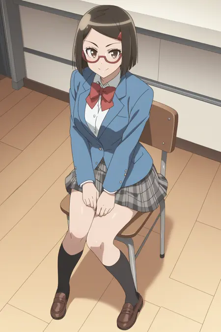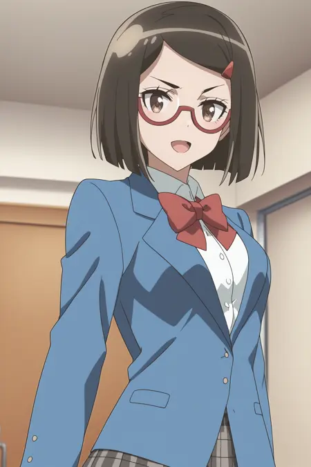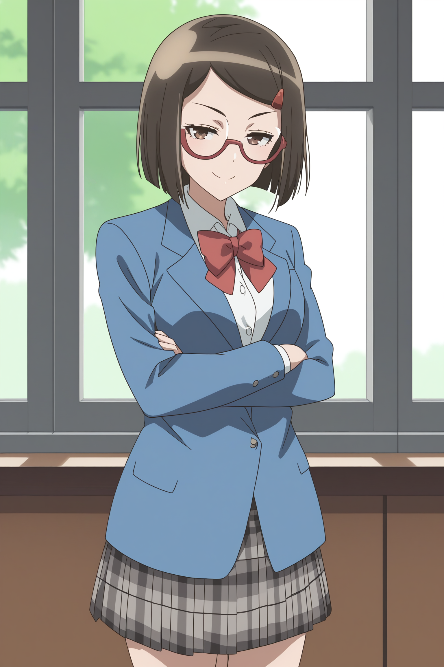 ohno midori, short hair, red hairclip, brown eyes, red semi-rimless eyewear, school uniform, blazer, blue jacket, long sleeves, red bowtie, white shirt, collared shirt, grey skirt, checkered skirt, pleated skirt, black kneehighs, loafers