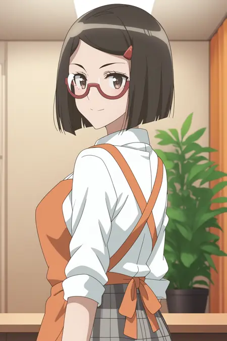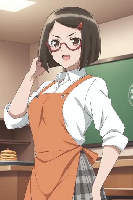 ohno midori, short hair, red hairclip, brown eyes, red semi-rimless eyewear, orange apron, red bowtie, white shirt, collared shirt, sleeves rolled up, grey skirt, checkered skirt, pleated skirt, black kneehighs, loafers
