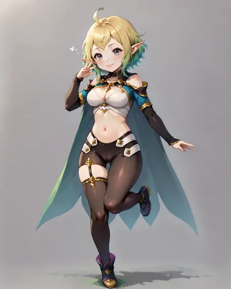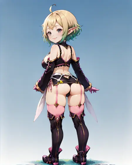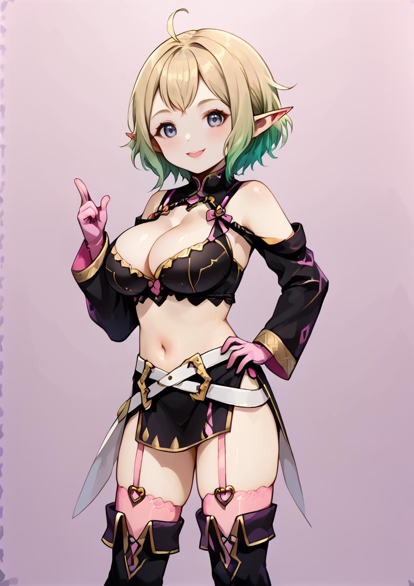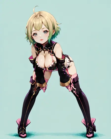 trags: nowimorgan, blonde hair, bangs, pointy ears, bare shoulders, black detach hood, black detached sleeves, bra, garter straps, pink thighhighs, black thigh boots, heels, white belts, navel, gloves