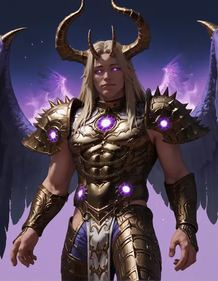 SigvaldDaemon, horns, wings, armor, glowing eyes, purple eyes, sword, shield,