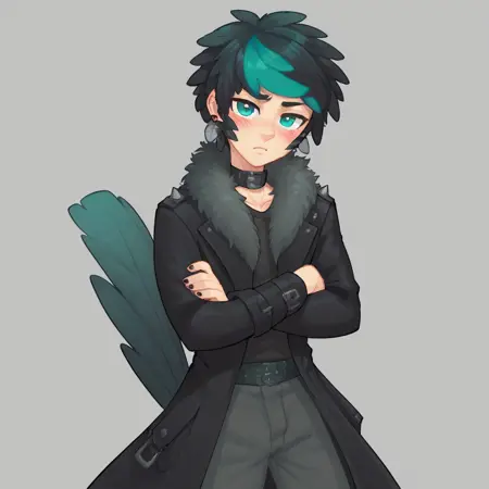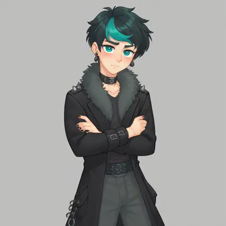 poe, 1boy, black hair, short hair, cyan stripe in hair, cyan eyes, piercing, earrings, choker, black coat, fur trim, wide belt, spikes, grey pants, collarbones, straps, black nail polish,