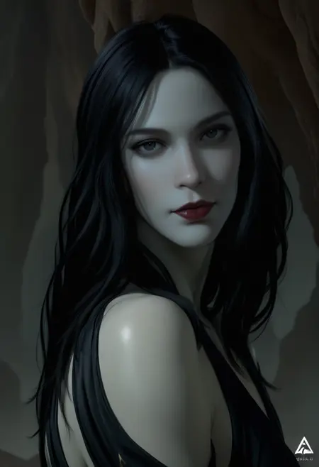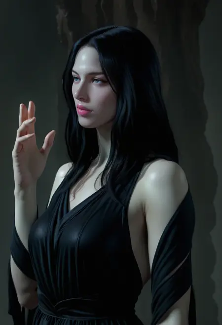 트리거 설명: Shelob, 1girl, solo, 검은 머리, 긴 머리, 검은 드레스, 드레스, 앉아 있음, 리얼리스틱, 입 닫음, 다리 노출, 어깨 노출, 시청자 바라봄, 창백한 피부, 붉은 입술,