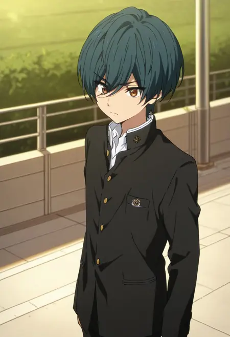 ikustart, 1boy, solo, male focus, school uniform, gakuran, shoes, pants, aqua hair, hair between eyes, short hair, brown eyes,