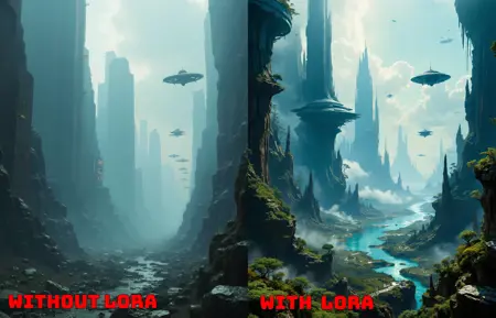 트리거 단어: 없음. 적어도 저는 별도의 트리거 단어를 지정하지 않았습니다. 그냥 추가만 하면 마법처럼 작동합니다. 색상과 대비를 향상시키고, 이미지의 판타지 및 과학적 요소를 강화하며, Flux로 생성된 풍경에 종종 보이는 고정된 느낌을 약간 제거해줍니다...