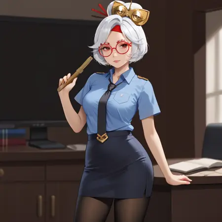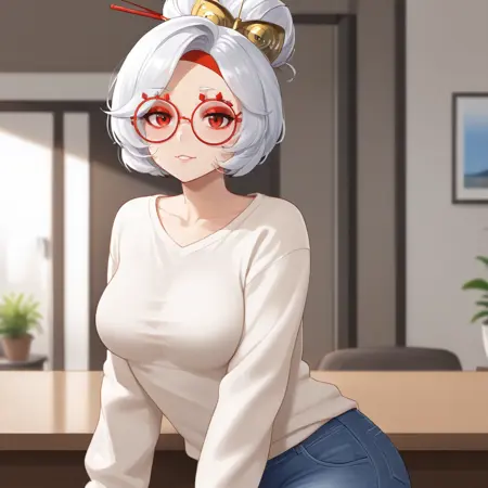 触发词:purah, 1girl, 眼镜, 白发, 黑手套, 中等乳房, 红框眼镜, 发饰, 露肩, 无袖上衣, 发簪, 夹克, 裸露肩膀, 短发, 头带