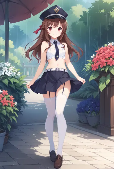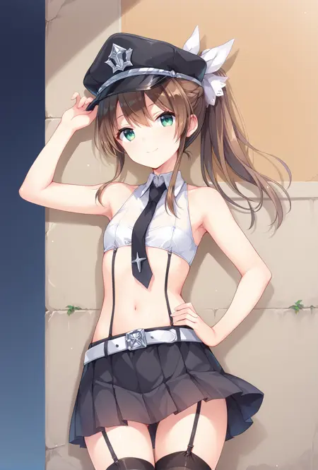 프롬프트: 스트랩치마, 소매 없는 상의, 가슴끈, 허벅지 양말, 검은 넥타이, 벨트, 배꼽/크롭탑