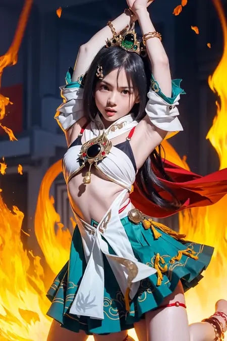 tag:yunli (honkai: star rail), 1girl,solo,long hair,black hair,twintails,hair ornament,yellow eyes,earrings,choker,jewelry,bare shoulders,sleeveless,shirt,bell,underboob,green skirt,navel,anklet,