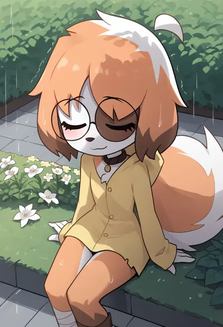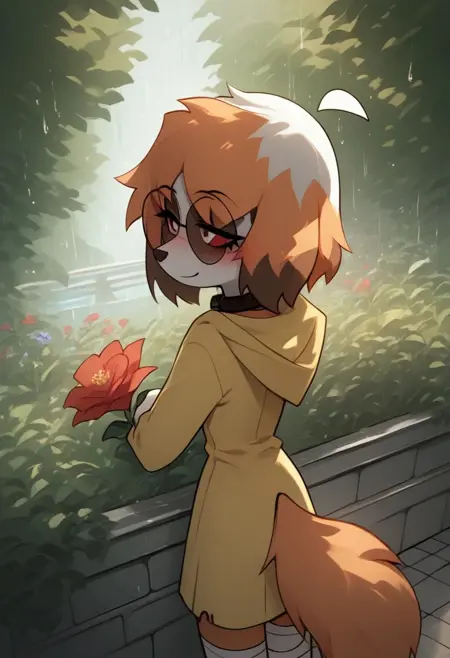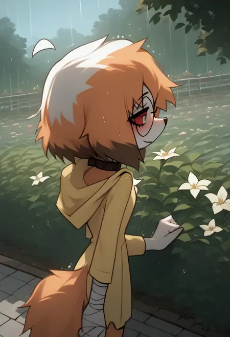 sol, furry, animal ears, dog ears, tail, ahoge, short hair, multicolored hair, orange hair, white hair, red eyes, white pupils,