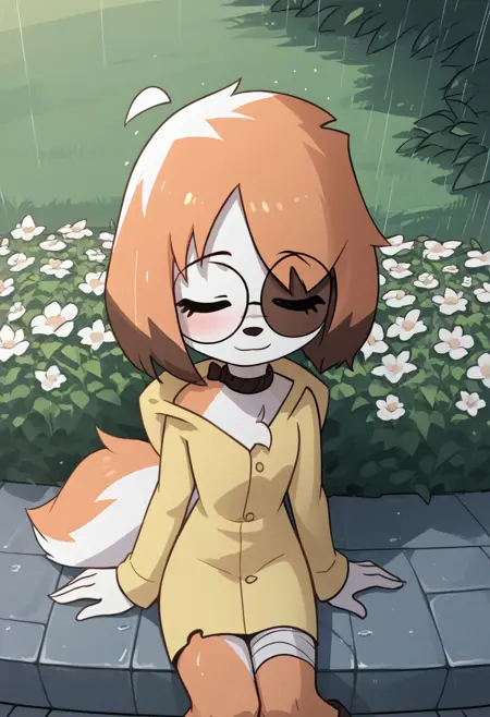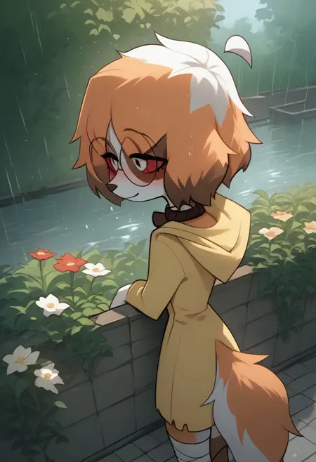 sunglasses, hood, rain coat, yellow coat, collar, bandaged legs