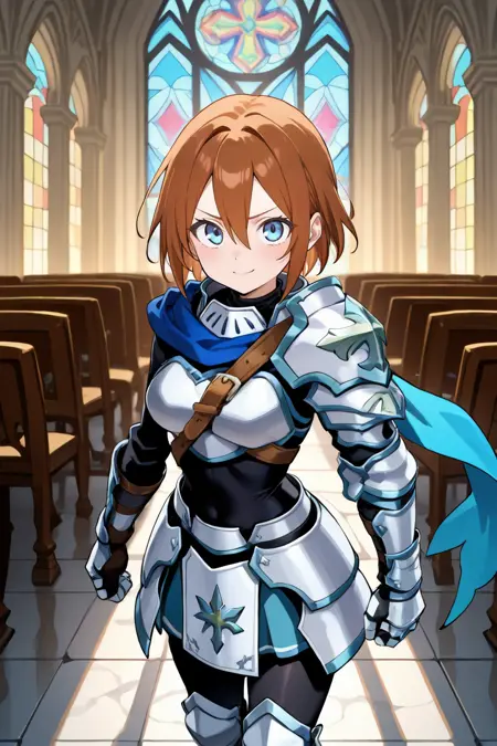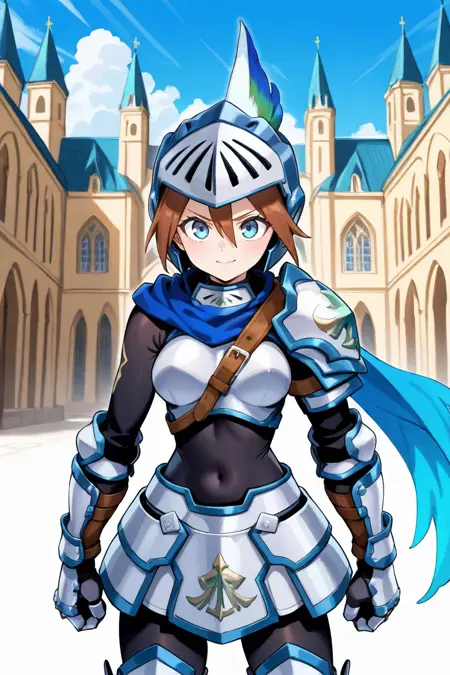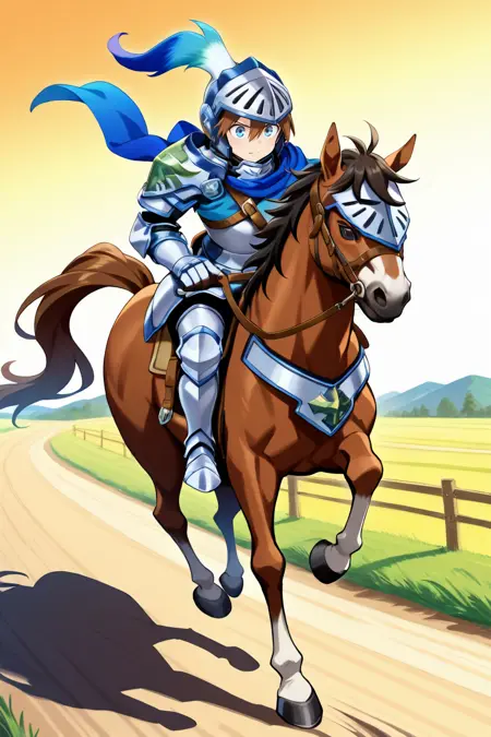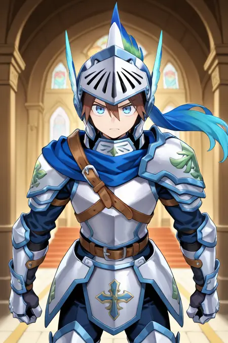유용한 태그: 1소년, 갈색 머리, 단발, 눈 사이의 머리, 파란 눈, 헬멧, 파란 플룸, 다색 플룸, 시야각(갑옷), 갑옷, 파란 스카프, 어깨 벨트, 단일 팔더온, 어깨 갑옷, 장갑, 정강이 보호대,