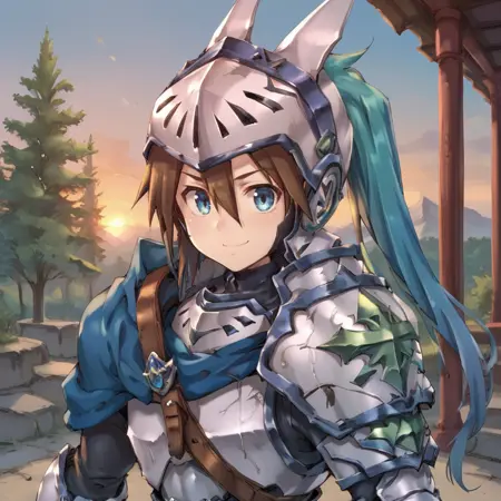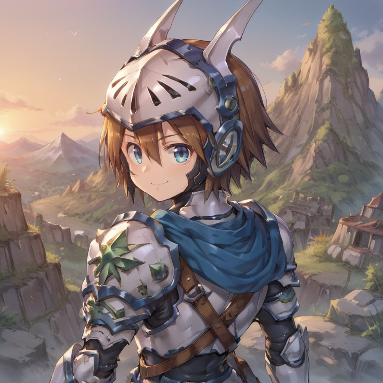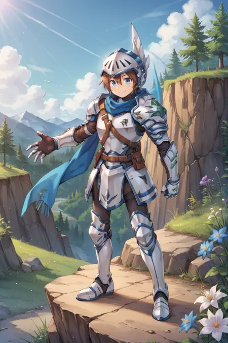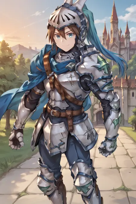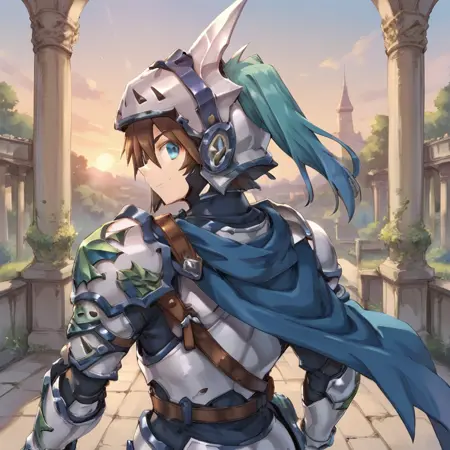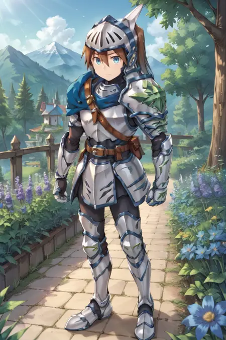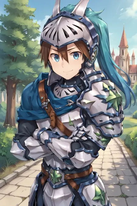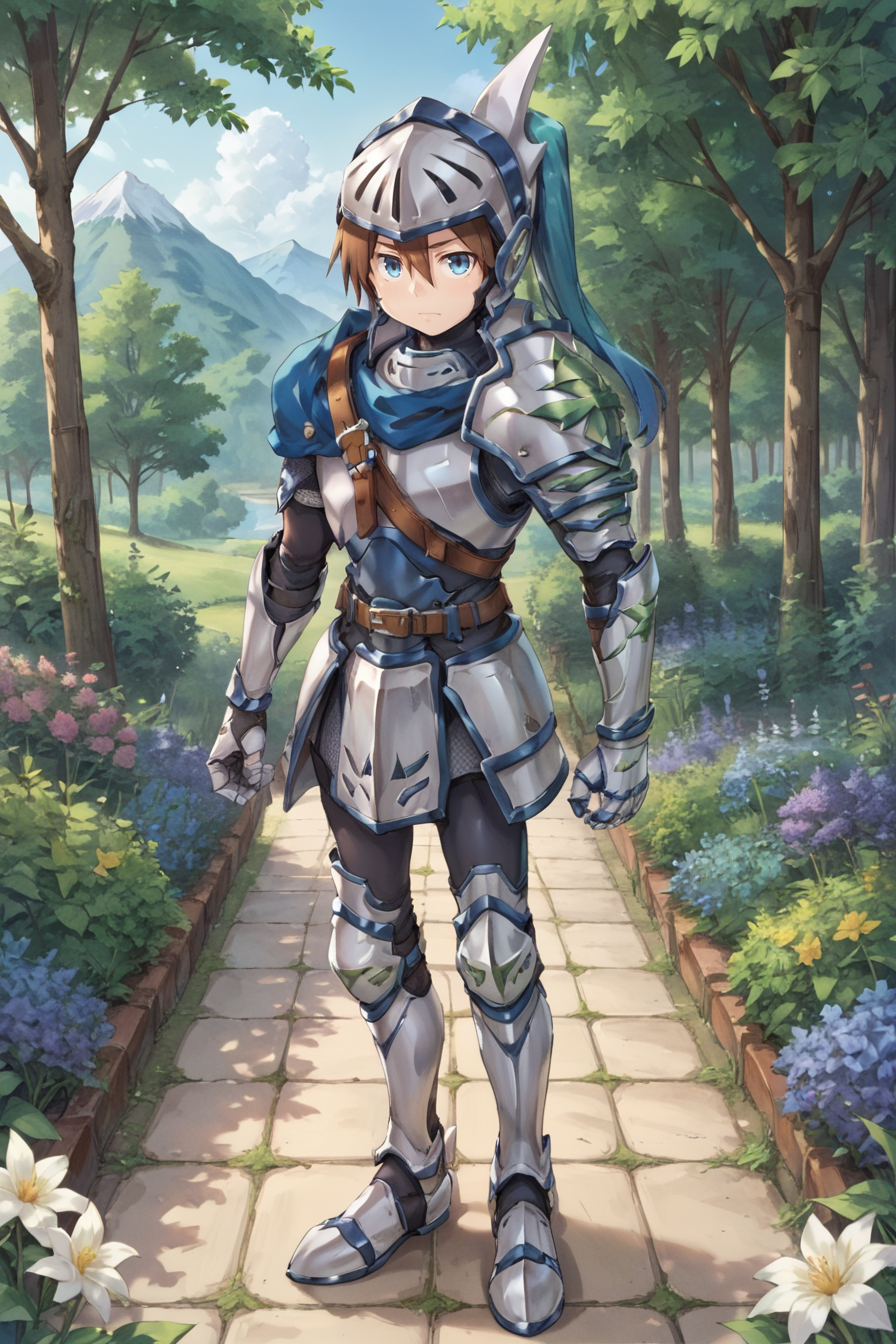 유용한 태그: 1소년, 갈색 머리, 단발, 눈 사이의 머리, 파란 눈, 헬멧, 파란 플룸, 다색 플룸, 시야각(갑옷), 갑옷, 파란 스카프, 어깨 벨트, 단일 팔더온, 어깨 갑옷, 장갑, 정강이 보호대,