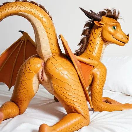 附加提示词:sandwing_wof, dragon, brown horns, claws, tail, golden scales, pale yellow underbelly, brown back mane, small nose spike, orange wings, green sclera, black slit pupils, 1girl, female