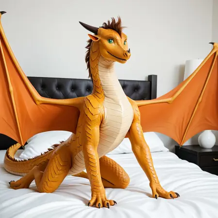 Additional prompts: sandwing_wof, dragon, brown horns, claws, tail, golden scales, pale yellow underbelly, brown back mane, small nose spike, orange wings, green sclera, black slit pupils, 1girl, female