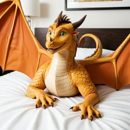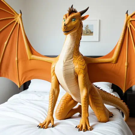 附加提示词:yellow scales, dragon, scales, horns, claws, wings, tail