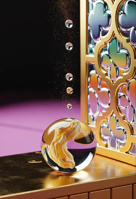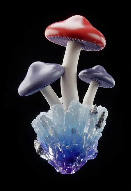 c1n3ma,一张3D渲染图像,展现一个令人赏心悦目、充满可爱氛围的微型雕塑,由几何小圆圈和拉伸的抽象矩形构成,下方有文字“FUTURE OF 3D”,背景为深色柔彩渐变,光线突出物体的轮廓与细节,营造出柔和温暖的氛围。c1n3ma,一张3D渲染图像,几何晶体结构与蘑菇交织成圆形,表面光泽,背景为柔彩渐变,光线突出物体的轮廓与细节,营造出柔和温暖的氛围。