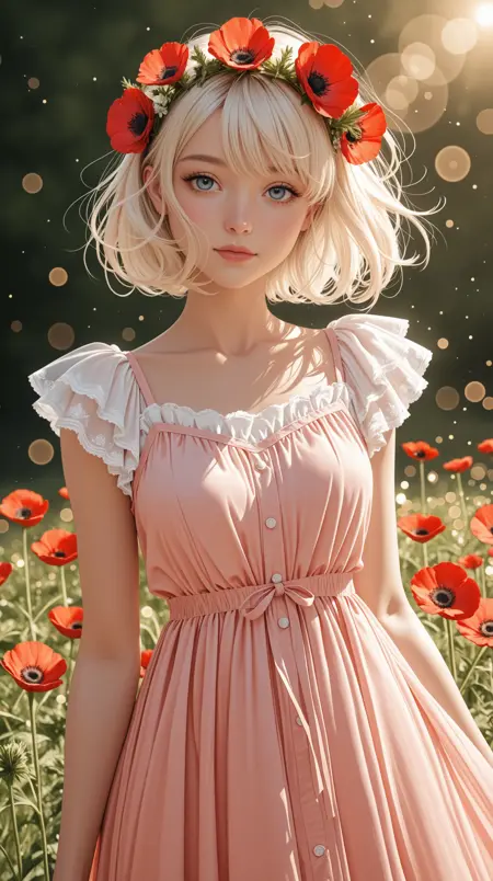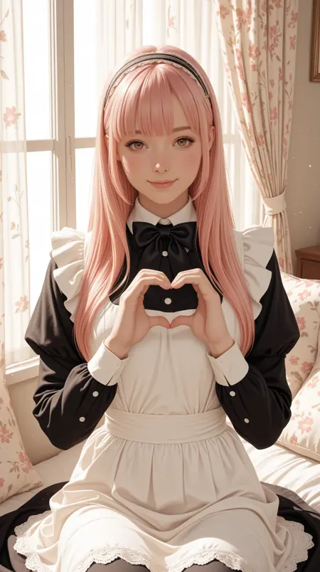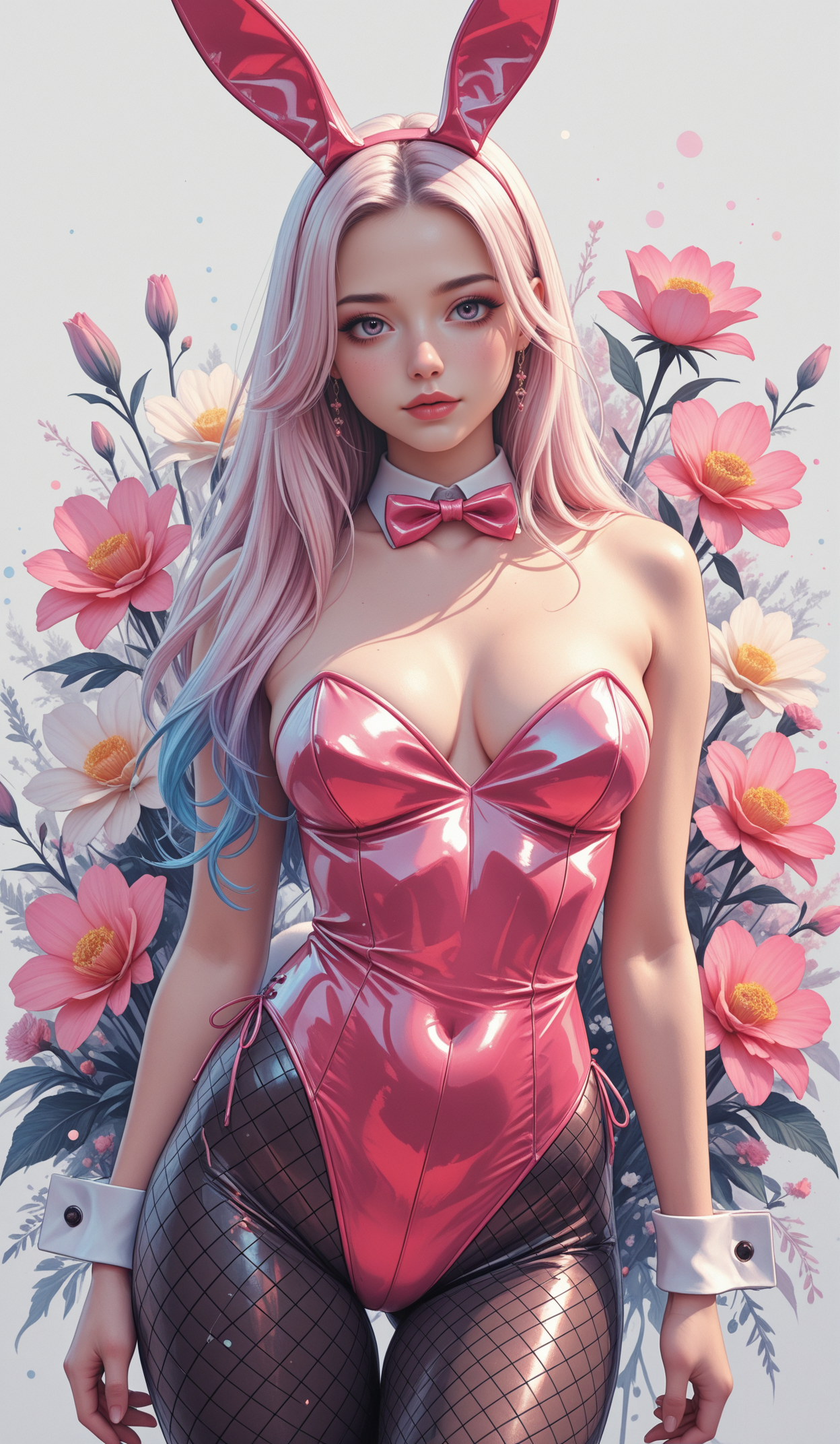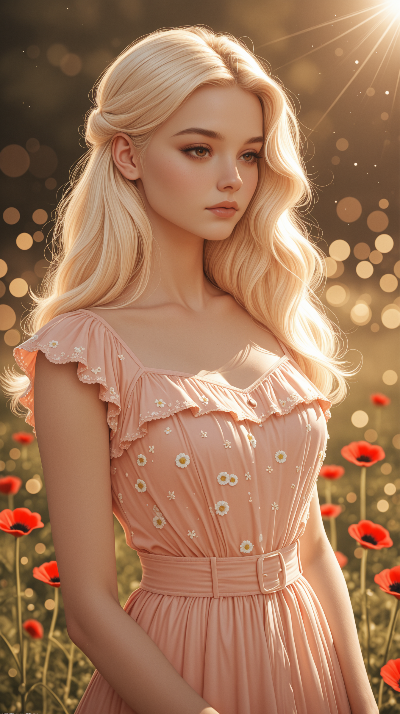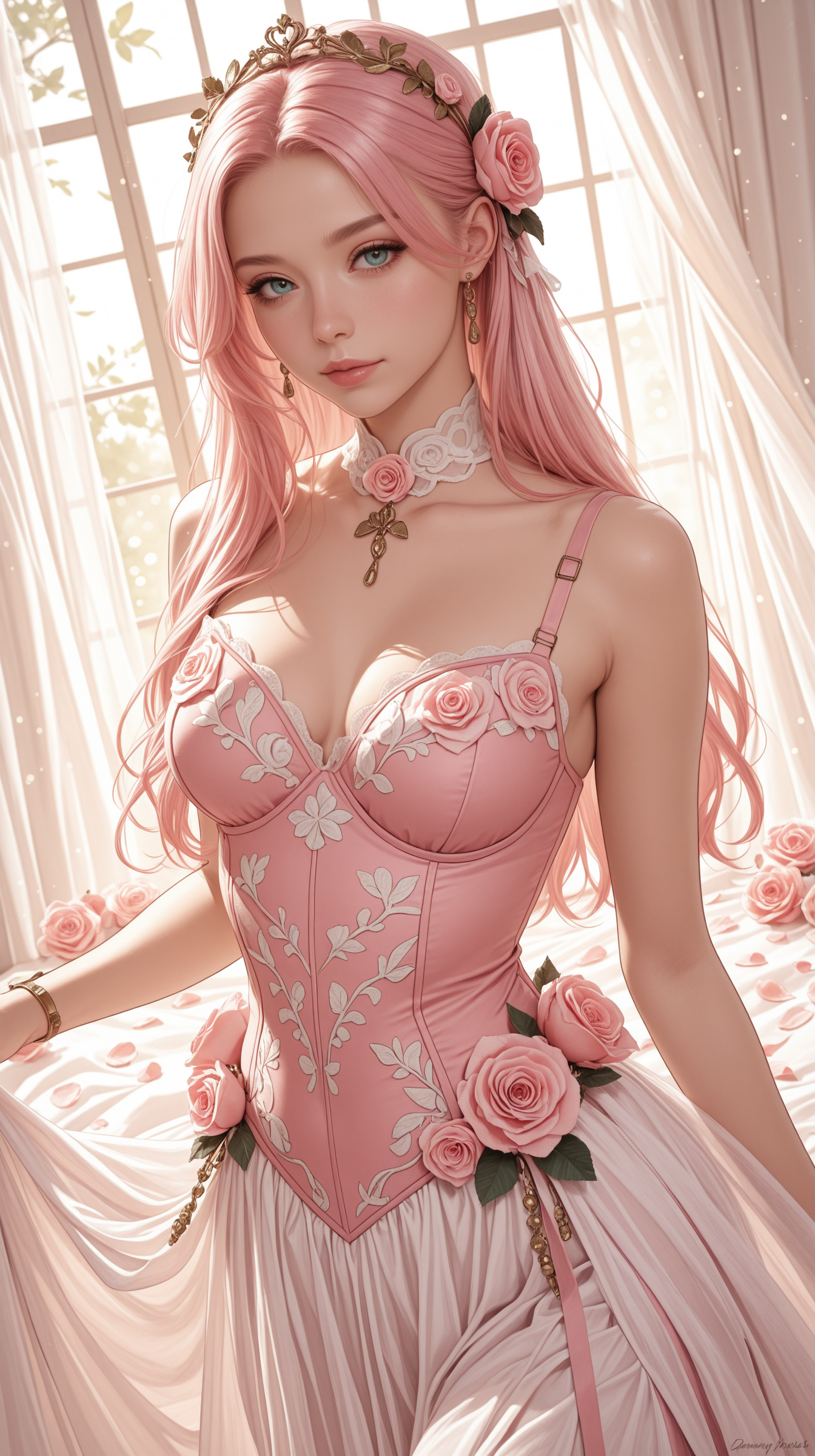 score_9, score_8_up, score_7_up, score_6_up, score_5_up, score_4_up, close up, cute, looking at viewer, woman, 22 years old, high ponytail, beauty, harmonious, face focus, a woman, blonde hair, black choker, posing, comic site, emotional, eye view, detailed, intimate, clear, personal, highly contrasted, excellent composition, advanced cinematic perfect light, highly color focused, dynamic, long hair, lush breasts, wide hips, front view, simple grey background, pastel pink detailed background, dynamic angle, lush breasts, pinup posing, dynamic angle, looking at viewer, sitting, ruffled dress, ribbons, floating hearts, selfie, smooth skin, glossy skin, and hyper-realistic with a luminous sheen, porcelain-like effect, slight gradients ,depth,glowing effect, three-dimensional feel
