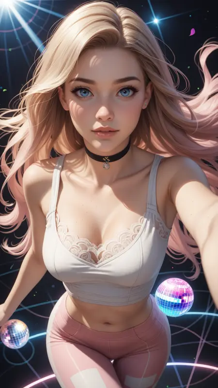 score_9, score_8_up, score_7_up, score_6_up, score_5_up, score_4_up, 特写,可爱,注视观众,女性,22岁,高马尾,美丽,和谐,面部聚焦,女性,金发,黑色项圈,摆姿势,漫画风格,情绪化,平视,细致,亲密,清晰,个人化,高对比度,优秀构图,高级电影级完美光影,高度色彩聚焦,动态,长发,丰满胸部,宽臀,正面视角,浅灰背景,淡粉色细致背景,动态角度,丰满胸部,写真姿势,动态角度,注视观众,坐着,褶皱连衣裙,丝带,漂浮的心,自拍,光滑肌肤,光泽肌肤,超现实且带发光光泽,瓷质效果,轻微渐变,深度,发光效果,三维感